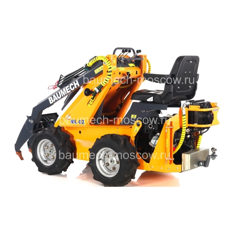 Гарантированная грузоподъёмность до 400 кг. - позволяет с лёгкостью перевозить материалы с высокой плотностью, такие как ПГС, цемент, раствор бетона и другие. Высота подъёма до 2,1 м. Мини-погрузчик Baumech ML-02 единственный в своём классе имеет высоту подъёма стрелы по шарниру 2,1 м, что позволяет ему грузить в самосвалы! Компактные размеры для работы в стеснённых условиях. Точное и мягкое управление. Простое техническое обслуживания с доступом к основным узлам. Гидромотор на каждое колесо! Дополнительная гидролиния (200 бар) для подключения внешнего оборудования. Трехконтурная гидросистема. Для максимально эффективной работы. Удобное кресло оператора. Для комфорта при длительной работе Корпус изготовлен из прочной стали 09Г2С. Высококачественные европейские гидравлические компоненты. Вес 650 кг. позволяет транспортировать погрузчик на легковом прицепе. Две скорости движения. 2 скорости движения. 1 передача - 5 км/ч., 2 передача - 10 км/ч. Двухскоростная гидравлическая трансмиссия обеспечивает максимальное усилие и плавность на первой передаче и максимальную скорость 10 км/ч с полной загрузкой на второй передаче. Более 50 видов навесного оборудования. Высокая энерговооружённость мини-погрузчика ML-02 позволяет нам предложить максимальное количество опций: культиватор, бордюроукладчик, планировщик, отвал для снега, щетка, и многое другое. Быстрое подключение навесного оборудования. Удобный фаркоп и дополнительный противовес.