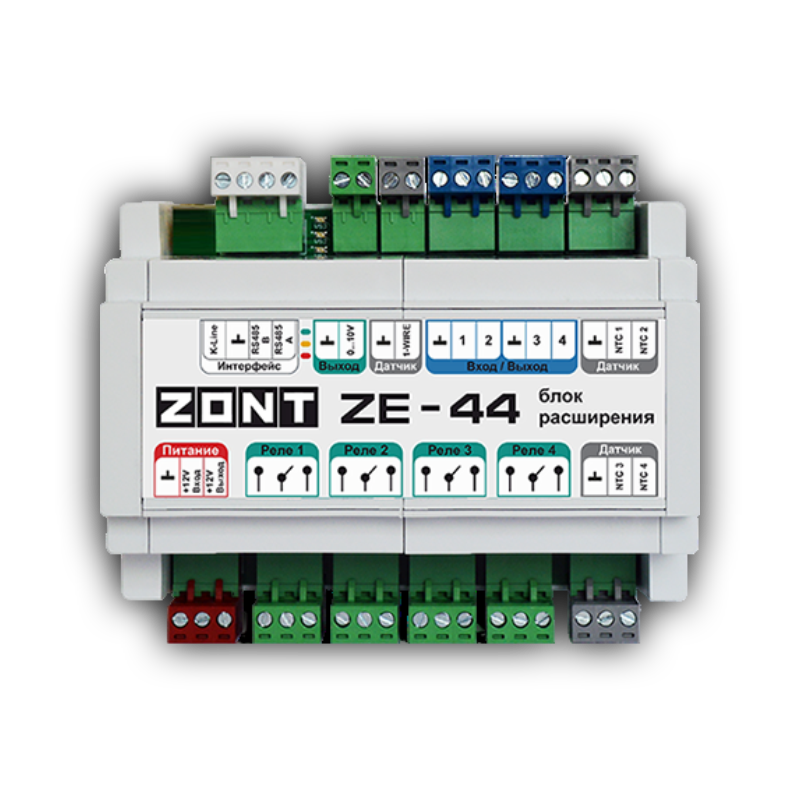 На объектах с многоконтурной системой отопления, где системой автоматизации могут быть охвачены несколько сооружений, для расширения аппаратных возможностей универсальных контроллеров ZONT H1000+ PRO, H1000+ PRO.V2, H1500+ PRO, H1500+ PRO.V2, H2000+ PRO, H2000+ PRO.V2, H5000+ PRO.V2 применяется блок расширения ZONT ZE-44.