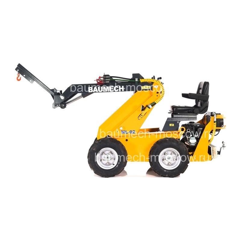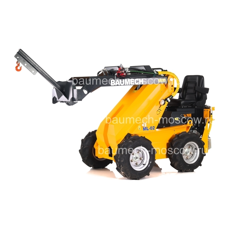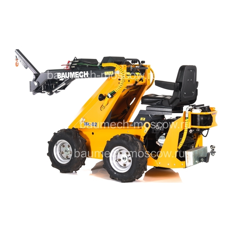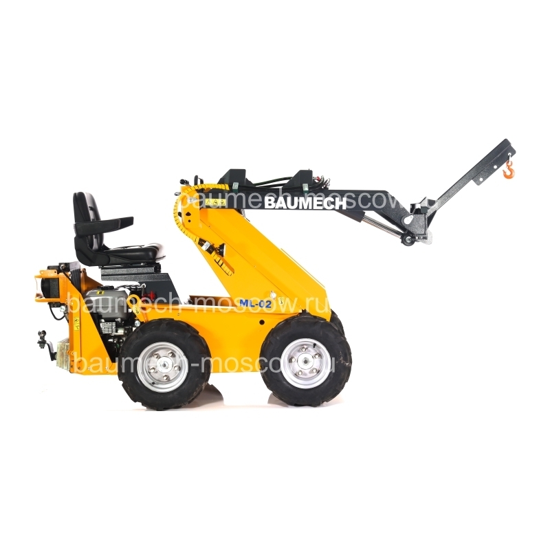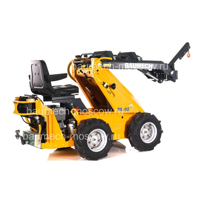 Гарантированная грузоподъёмность до 400 кг. - позволяет с лёгкостью перевозить материалы с высокой плотностью, такие как ПГС, цемент, раствор бетона и другие. Высота подъёма до 2,1 м. Мини-погрузчик Baumech ML-02 единственный в своём классе имеет высоту подъёма стрелы по шарниру 2,1 м, что позволяет ему грузить в самосвалы! Компактные размеры для работы в стеснённых условиях. Точное и мягкое управление. Простое техническое обслуживания с доступом к основным узлам. Гидромотор на каждое колесо! Дополнительная гидролиния (200 бар) для подключения внешнего оборудования. Трехконтурная гидросистема. Для максимально эффективной работы. Удобное кресло оператора. Для комфорта при длительной работе Корпус изготовлен из прочной стали 09Г2С. Высококачественные европейские гидравлические компоненты. Вес 650 кг. позволяет транспортировать погрузчик на легковом прицепе. Две скорости движения. 2 скорости движения. 1 передача - 5 км/ч., 2 передача - 10 км/ч. Двухскоростная гидравлическая трансмиссия обеспечивает максимальное усилие и плавность на первой передаче и максимальную скорость 10 км/ч с полной загрузкой на второй передаче. Более 50 видов навесного оборудования. Высокая энерговооружённость мини-погрузчика ML-02 позволяет нам предложить максимальное количество опций: культиватор, бордюроукладчик, планировщик, отвал для снега, щетка, и многое другое. Быстрое подключение навесного оборудования. Удобный фаркоп и дополнительный противовес.