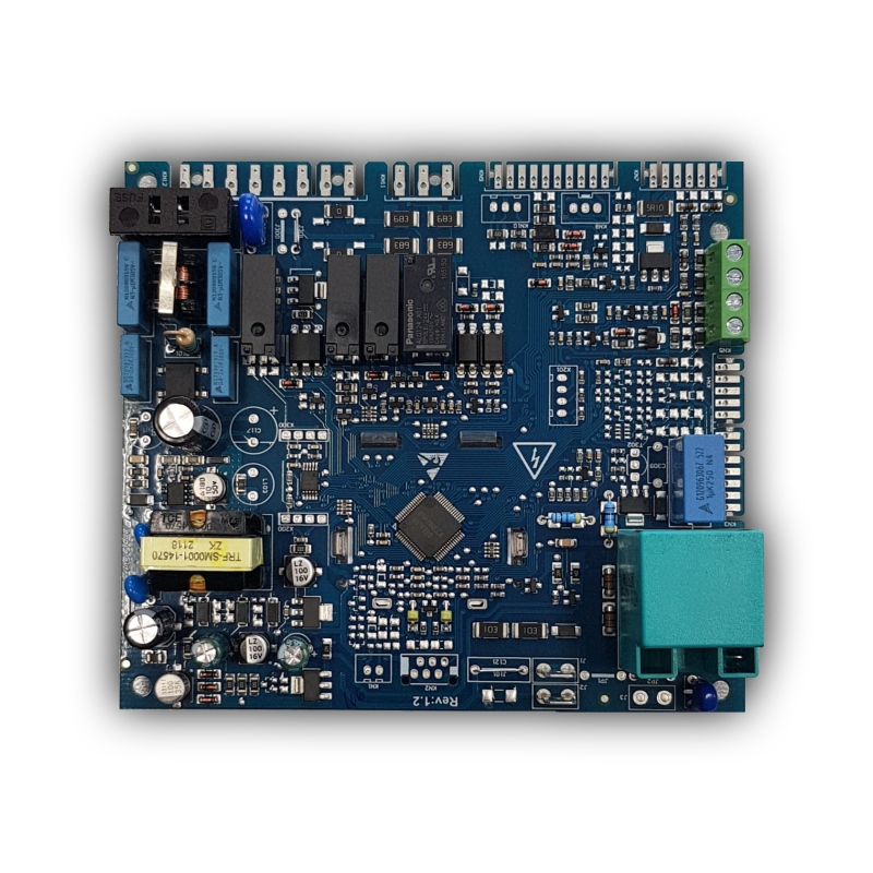 Основные функции - электропитание и управление работой котла в нормальной и аварийных ситуациях, взаимодействие и управление всеми электрическими и электронными компонентами котла. С помощью платы управления котлом осуществляются все операции по контролю процессами, управлению и отображению на жидкокристаллическом дисплее. Электронная плата - узловая деталь, к которой подключаются все датчики, защитные устройства и исполнительные механизмы. В газовых котлах используются платы управления с дисплеем Federica Bugatti (управление кнопками на панели котла), так и платы (управление осуществляется ручками регулировки.) С помощью платы управления котлом Федерика Бугатти осуществляются все операции по контролю процессами, управлению и отображению на жидкокристаллическом дисплее. Электронная плата управления Federica Bugatti находится на откидной панели котла под пластиковой крышкой. С помощью данной платы осуществляется взаимодействие и управление всеми электрическими и электронными компонентами котла. На конденсационных котлах электронная плата котла Федерика Бугатти может изменять частоту вращения вентилятора, в зависимости от режимов работы котла и конфигурации дымохода. Изменение частоты оборотов происходит за счет частотного регулирования и контролируется реле расхода дымовых газов, посредством электронной платы котла. Дисплей LCD демонстрирует состояние котла и сообщает информацию о его работе.